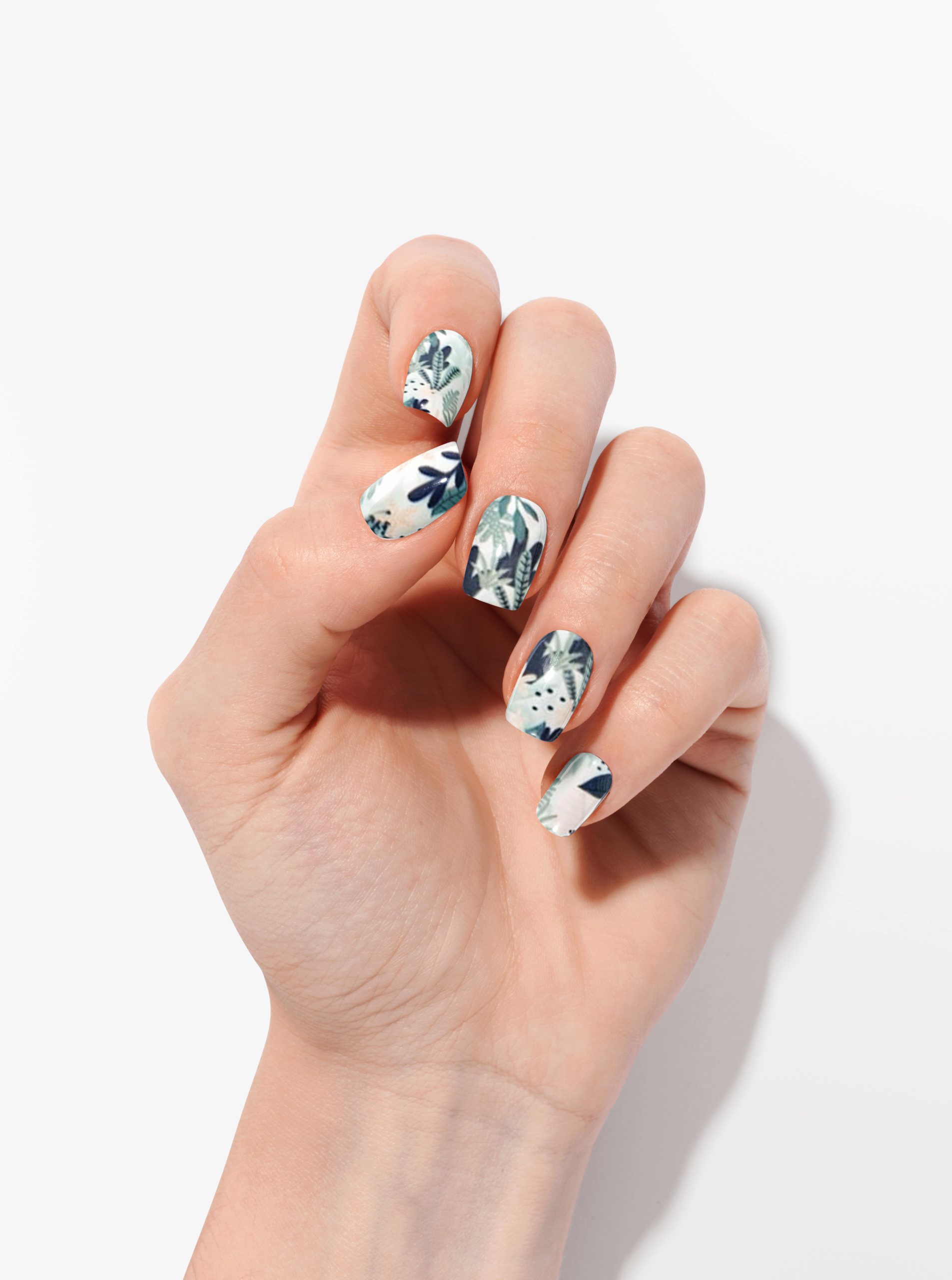 Ces stickers pour ongles Amazonie présentent des motifs végétaux aux teintes vertes et bleu-gris, évoquant la luxuriance de la forêt tropicale.
