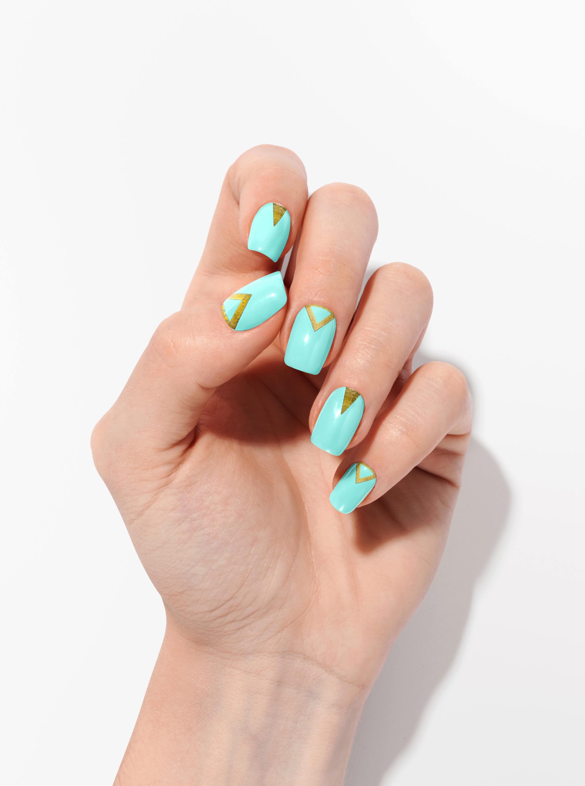 Des stickers pour ongles turquoise avec un jeu de triangles dorés.